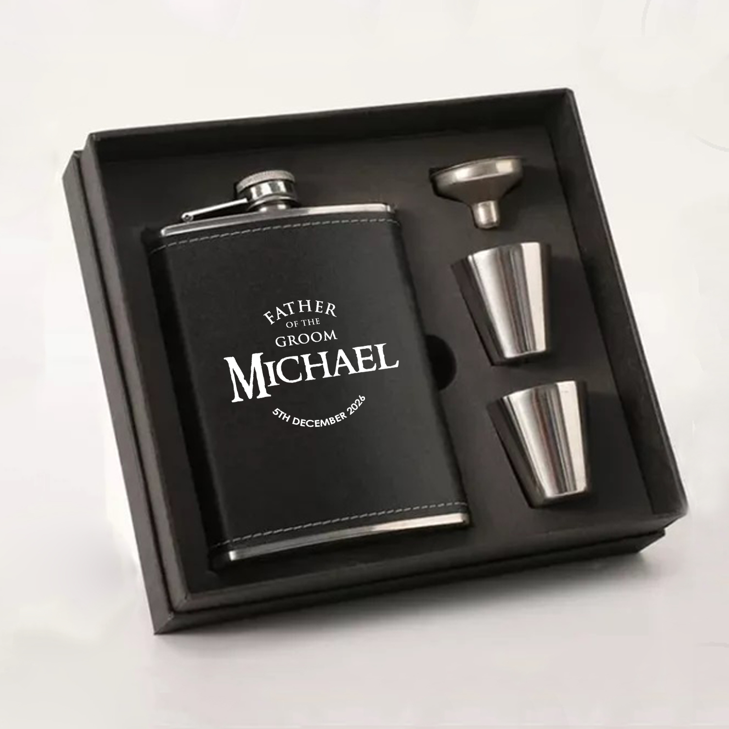 Hip flask sets come with a black leather flask, funnel and 2 shot glasses all presented in a black gift box.